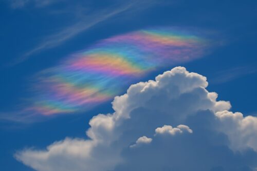 虹と似ていますが、虹よりも柔らかく淡い色合いで、雲の縁が虹色に輝くのが特徴です。